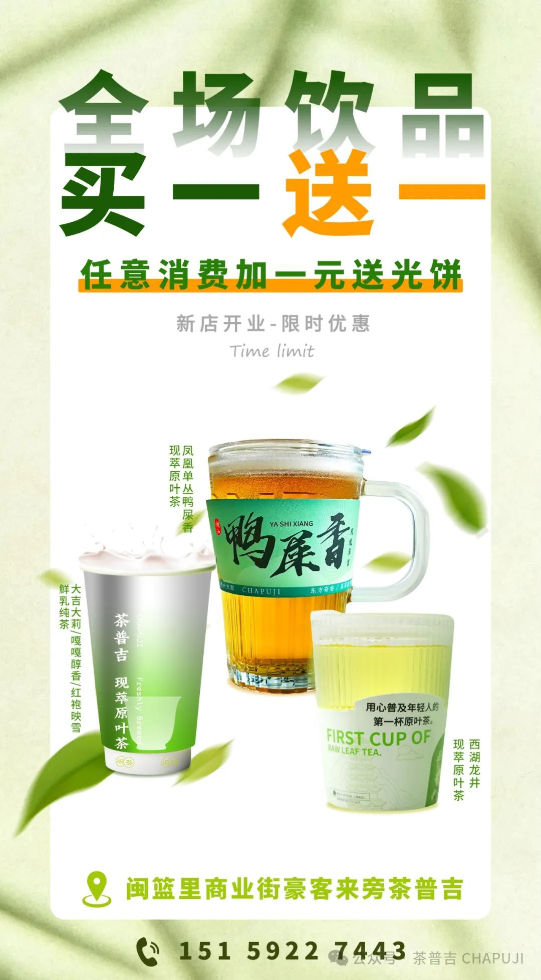 亲爱的茶友们在中秋国庆来临之际我们满心欢喜地宣布:「茶普吉」闽篮里商业街全新分店盛大开业啦!这将开启我们与您之间全新味觉之旅。【开业福利,惊喜连连】全场饮品,买一送一任意消费加一元送光饼【茶普吉 —